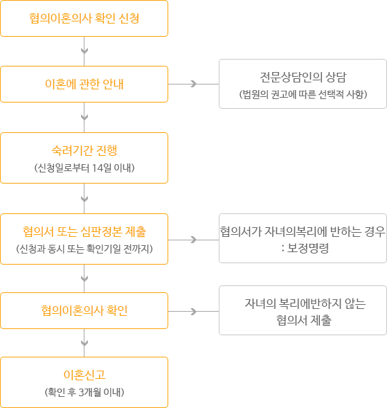 - 위 ‘안내’를 받은 날부터 양육하여야 할 자(임신 중인 자를 포함함)가 있는 경우는 3개월, 없는 경우는 1개월이 지난 후에 이혼의사의 확인을 받을 수 있습니다.